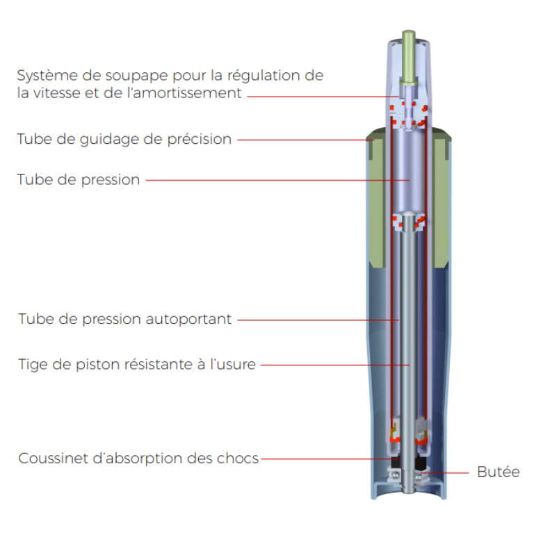 Composé d'un tube de pression et d'un tube de guidage. Le tube de pression autoportant est conçu pour permettre des moments de flexion si la charge n'est pas centrée sur l’assise
